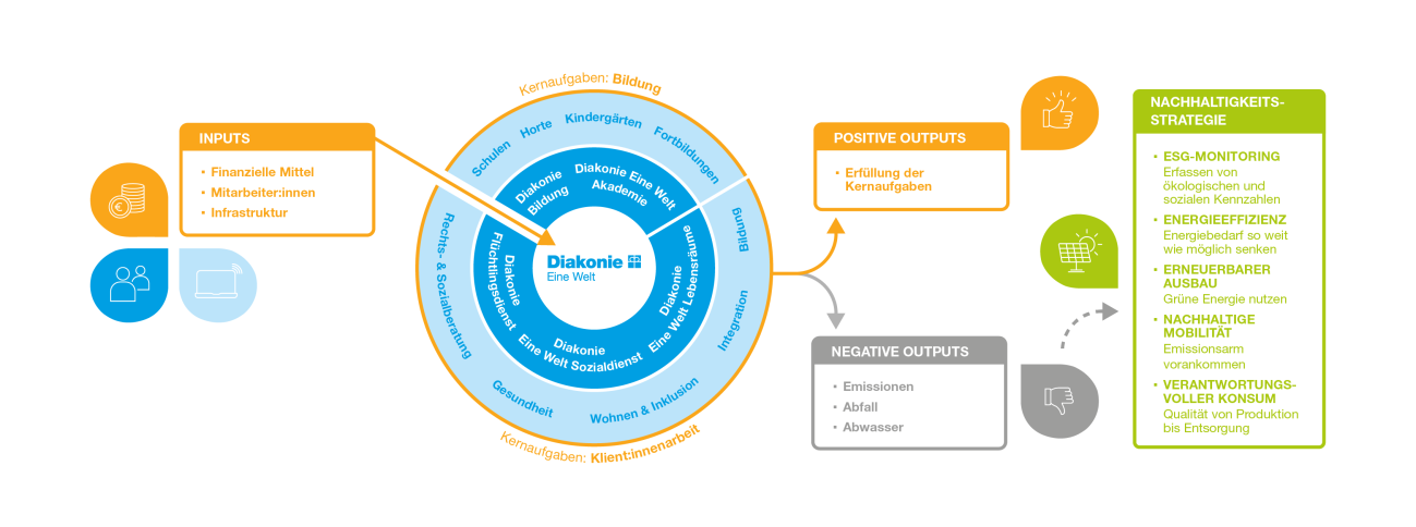 Auch wenn die Diakonie Eine Welt (DEW) keine Produkte herstellt, entsteht bei uns ökonomisch gesprochen eine Wertschöpfungskette. Die vereinfachte Grafik veranschaulicht die Prozesse der DEW, wobei alle Begriffe schlagwortartig die Vielfalt unserer Arbeit andeuten. Sie zeigt, wie durch den Einsatz von Ressourcen Kernaufgaben in den verschiedenen Bereichen erfüllt werden, welche positiven und negativen Outputs dabei entstehen und wie wir mit diesen umgehen.