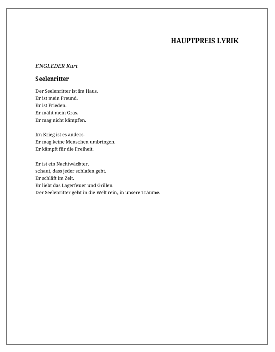 Mit „Seelenritter“ wurde heuer ein Gedicht ausgezeichnet, das mit klaren Bildern und einer direkten, eigenen Sprache arbeitet. Der Text spricht von Freundschaft, Frieden und Schutz. Gerade diese Unmittelbarkeit machte ihn besonders.