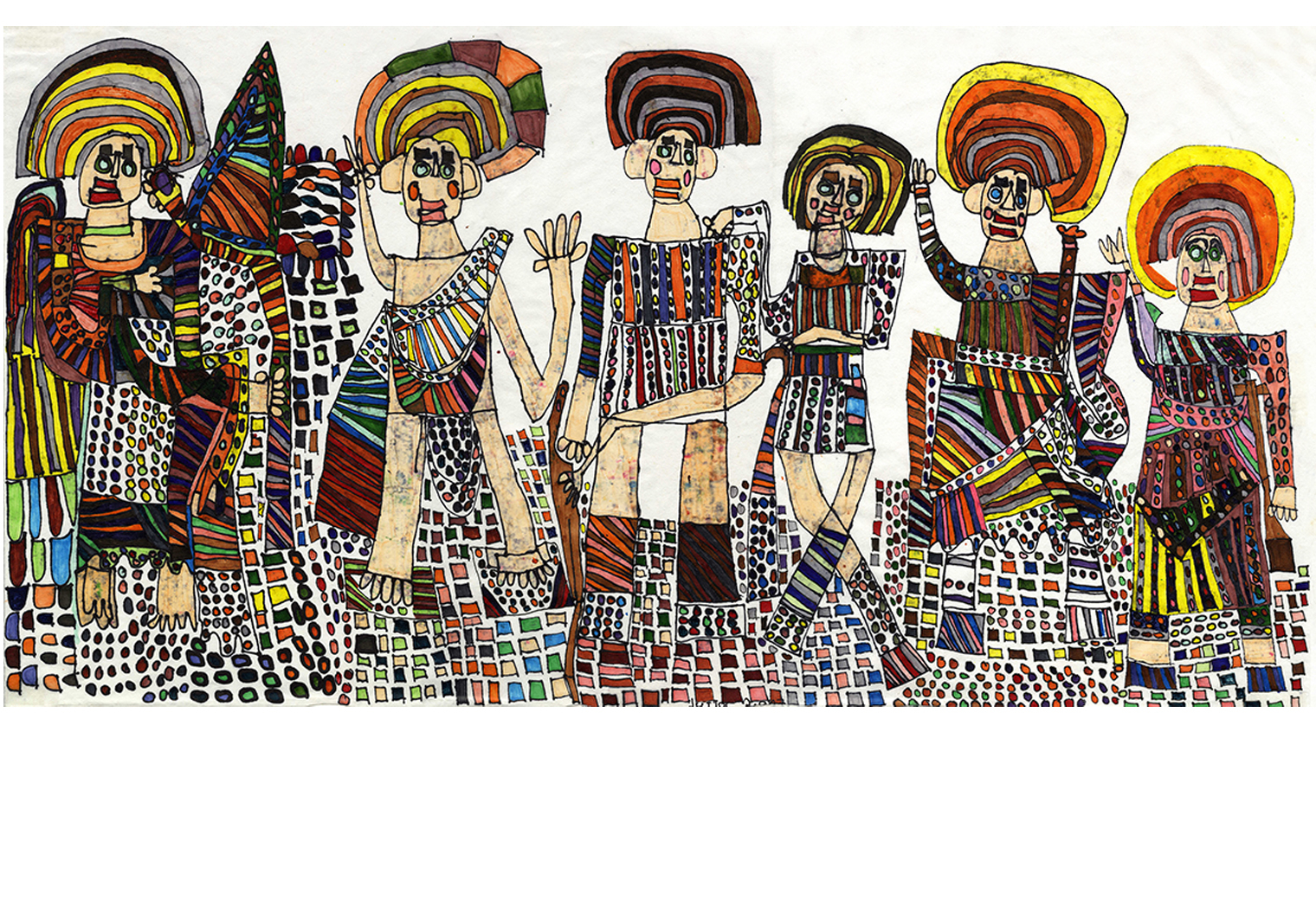 Mit viel Ausdauer arbeitet sie akribisch an ihren bunten Bildern. Das produktive, schematische Arbeiten an einem Thema, über einen langen Zeitraum, ist für sie typisch.