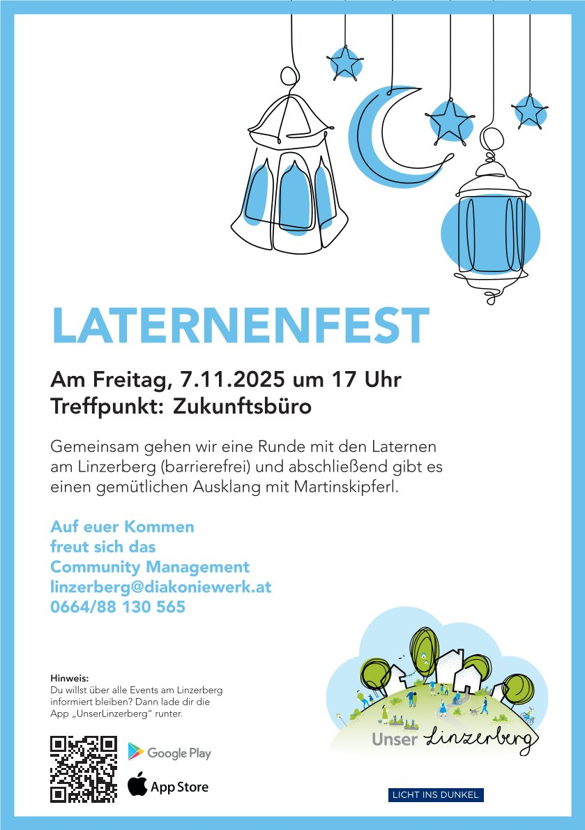 Gemeinsam gehen wir eine Runde mit den Laternen am Linzerberg (barrierefrei) und abschließend gibt es einen gemütlichen Ausklang mit Martinskipferl.