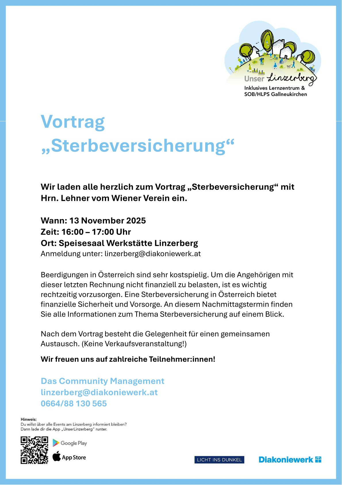Wir laden alle herzlich zum Vortrag "Sterbeversicherung" ein